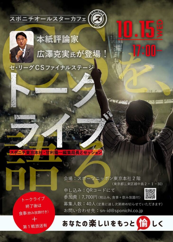 10月15日(水)にカフェ ラ ロビーにて、スポーツニッポン新聞社主催「スポニチオールスターカフェ」を開催します 投稿日: 2025年10月3日 投稿者: sttonichi スポーツニッポン新聞社主催の元、評論家・広澤克実氏が2025年のプロ野球セ・リーグクライマックスシリーズファイナルステージを展望する「スポニチオールスターカフェ 本紙評論家・広澤克実氏が語る!セ・リーグ クライマックスシリーズ ファイナルステージ トークライブ」を開催します。 観覧をご希望の方はこちらのサイトからお申し込みください。 https://sponichi-plus-alpha.sponichi.net/bunka-geinou/sn-allstarcafe251015/」